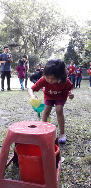 Permainan Pertamini adalah memindahkan air dari bak ember ke dalam botol menggunakan gelas yang berlubang. Supaya air yang dibawa tetap terkumpul banyak maka peserta dituntut untuk cepat lari menuju botol permainan. Hal ini dilakukan secara bergantian antar anggota kelompok dengan bertujuan peserta untuk terbiasa antri dan melatih peserta untuk bersama-sama maju menuju ke satu tujuan. Dalam hal ini mengumpulkan air sebanyak mungkin supaya kelompoknya bisa menang karena setiap anggota kelompok sekecil apapun tetap berkontribusi dalam kelompok.