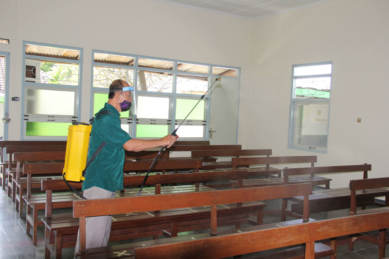Sesuai dengan anjuran protokol kesehatan, seluruh umat dianjurkan untuk segera meninggalkan area gereja dan pulang ke rumah masing-masing seusai ekaristi. Namun meskipun demikian tugas dari tata laksana paroki belum usai. Sesaat setelah ekaristi selesai, dua orang petugas melakukan penyemprotan desinfektan di area gereja, sebagai upaya pencegahan penularan virus Covid-19.